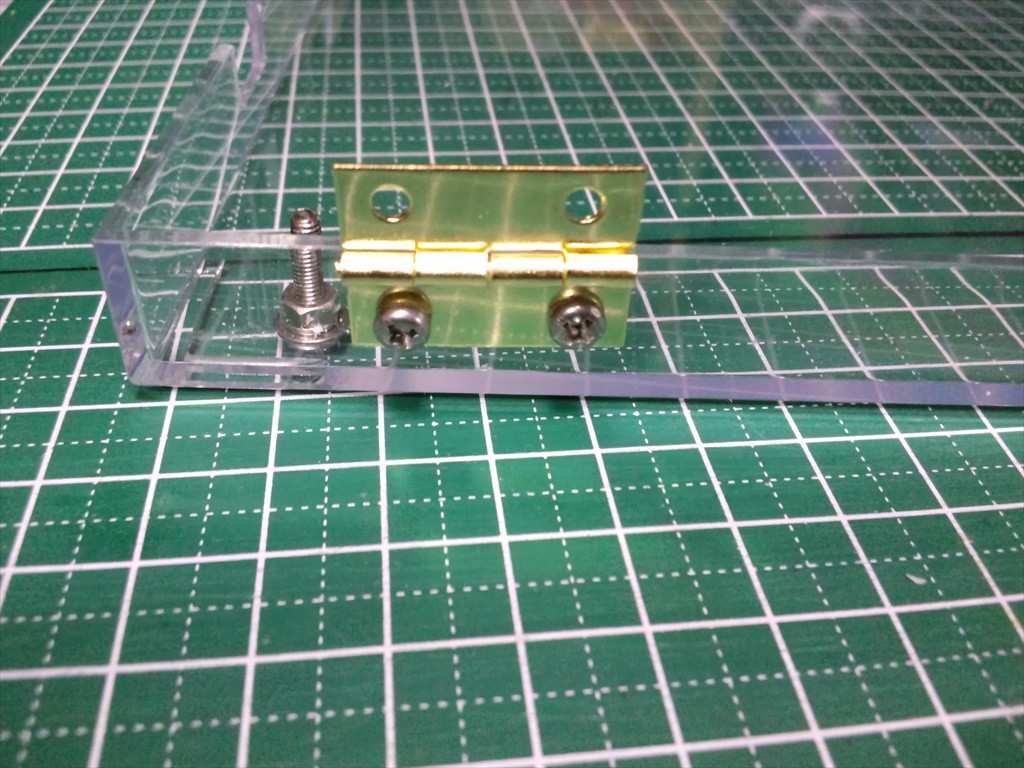 片側に蝶番を付けてみました。これも100均で。細い穴は精密ドライバーで調整。