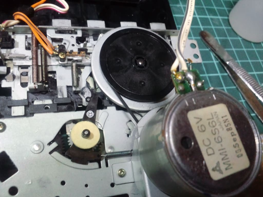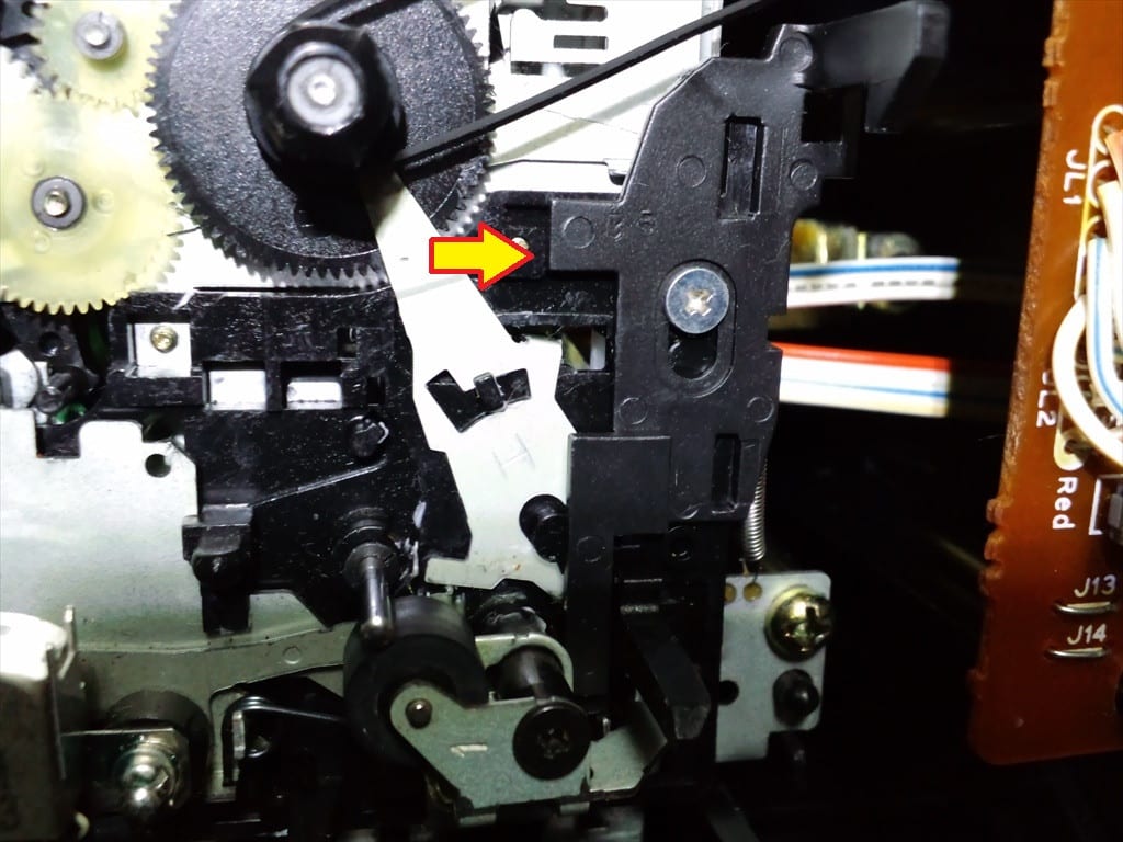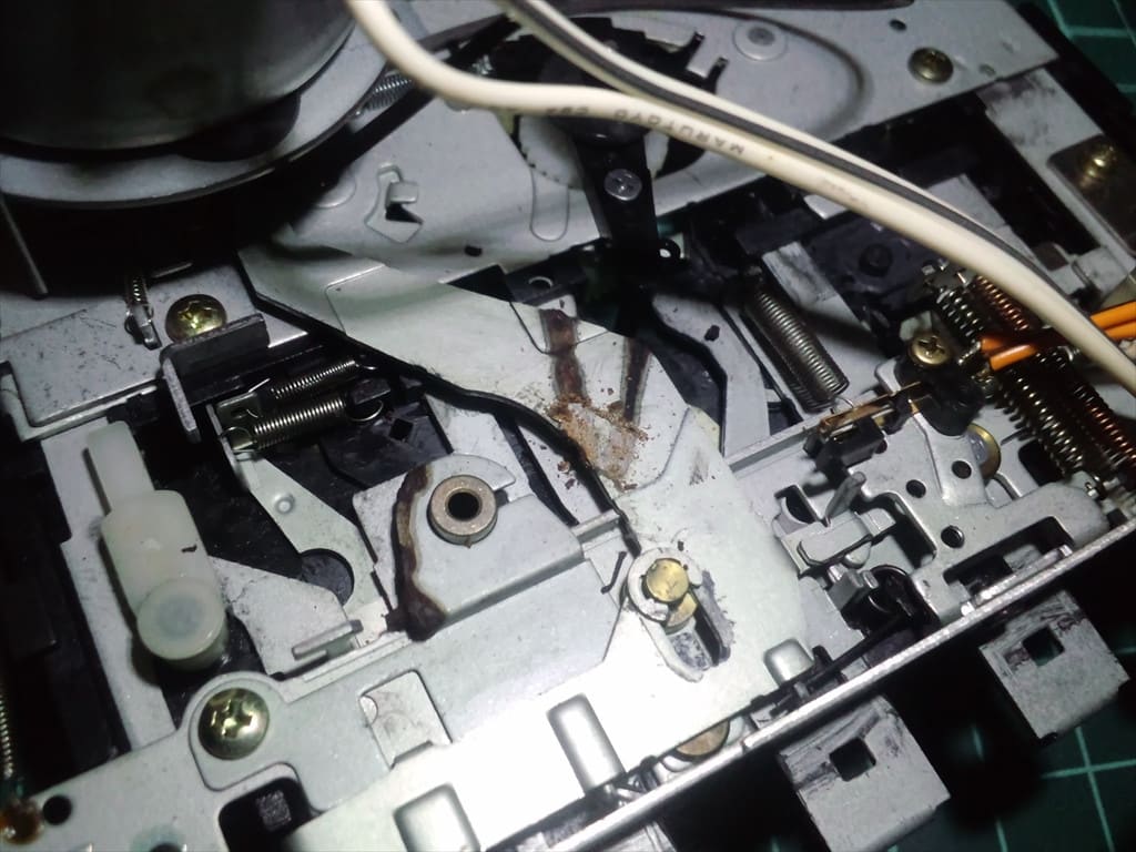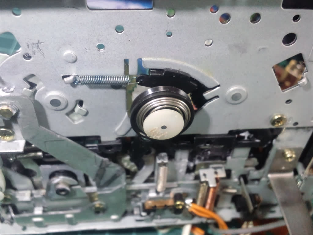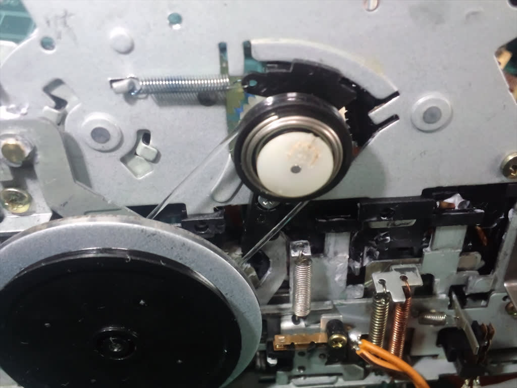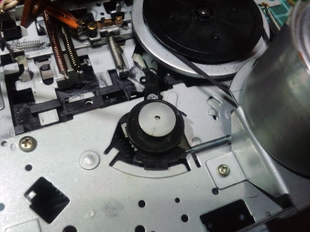 カセットデッキ背面の構造を見ていると、巻き取り駆動用のギアの裏側にベルトがかかっていません。
