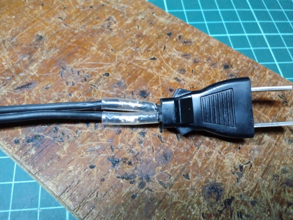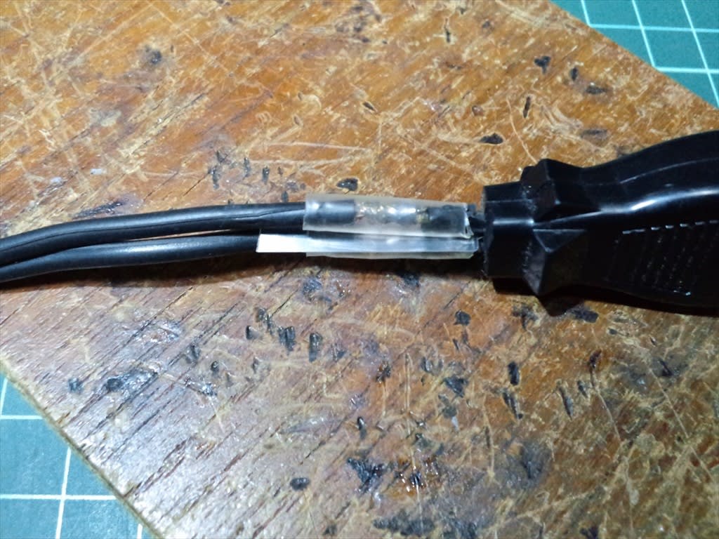 ハンダ付けして熱収縮チューブを被せましたが100V用では無く心配なので絶縁板を挟みました。